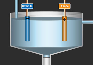 Electrodes are cleaned periodically by stopping the pump and reversing polarity (+/-).