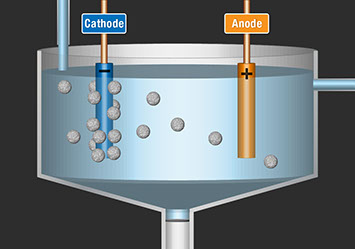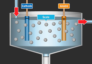 Scale particles in the electrolytic tank adhere to the cathode (-).
